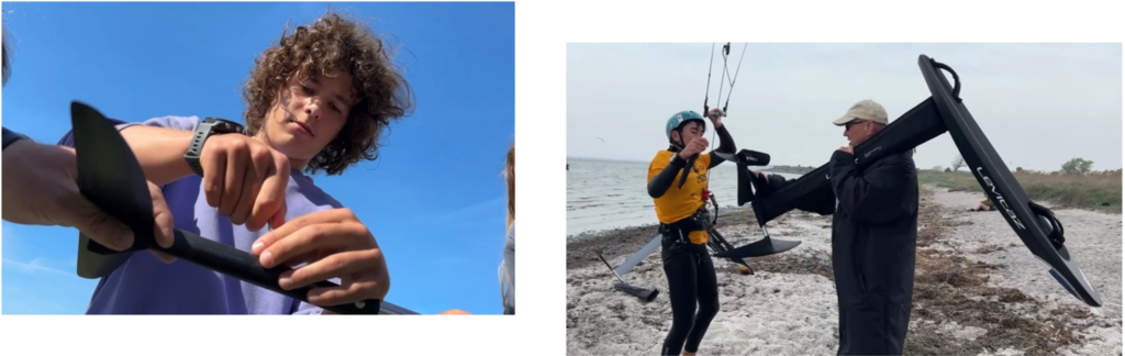 Unter Anleitung von Flysurfer/Levitaz – Vertriebsmitarbeiter uns Masters-Weltcup-Fahrer Christian Hügel erlernten die Teilnehmerinnen und Teilnehmer das korrekte Zusammenbauen und perfekte Trimmen der Kitefoils. Christian Hügel konnte den Jugendlichen auch einige Expertentipps und Insiderinfomationen zum Material geben.