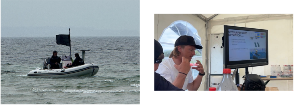Im Fokus des Camps standen also der sichere Umgang mit dem Kitesurf-Material sowie die Technik des Foilens, das präzise Anfahren von Tonnen sowie taktische Entscheidungen während eines Rennens. Unterstützt wurde das Training durch den Einsatz eines Begleitbootes, dessen Crew mit Bojen realitätsnahe Regattakurse legte. So konnten die jungen Sportler unter nahezu wettkampfähnlichen Bedingungen trainieren.